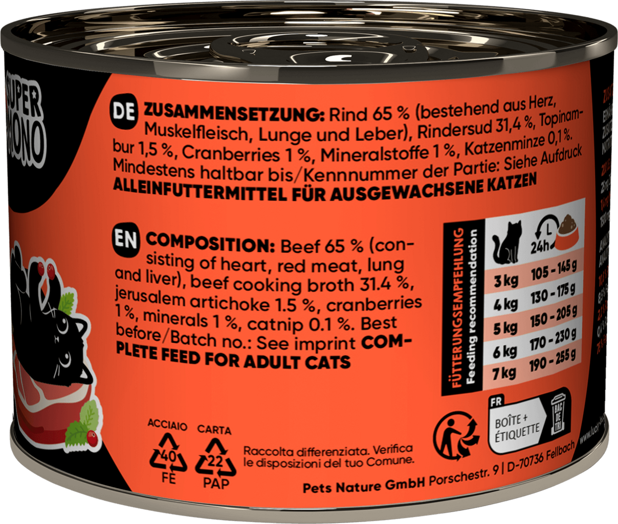 65 % Beef (Heart, Muscle meat, Lung, Liver), 31,4 % Beef broth, 1,5 % Jerusalem artichoke, 1 % Cranberries, 1 % Minerals, 0,1 % Catnip