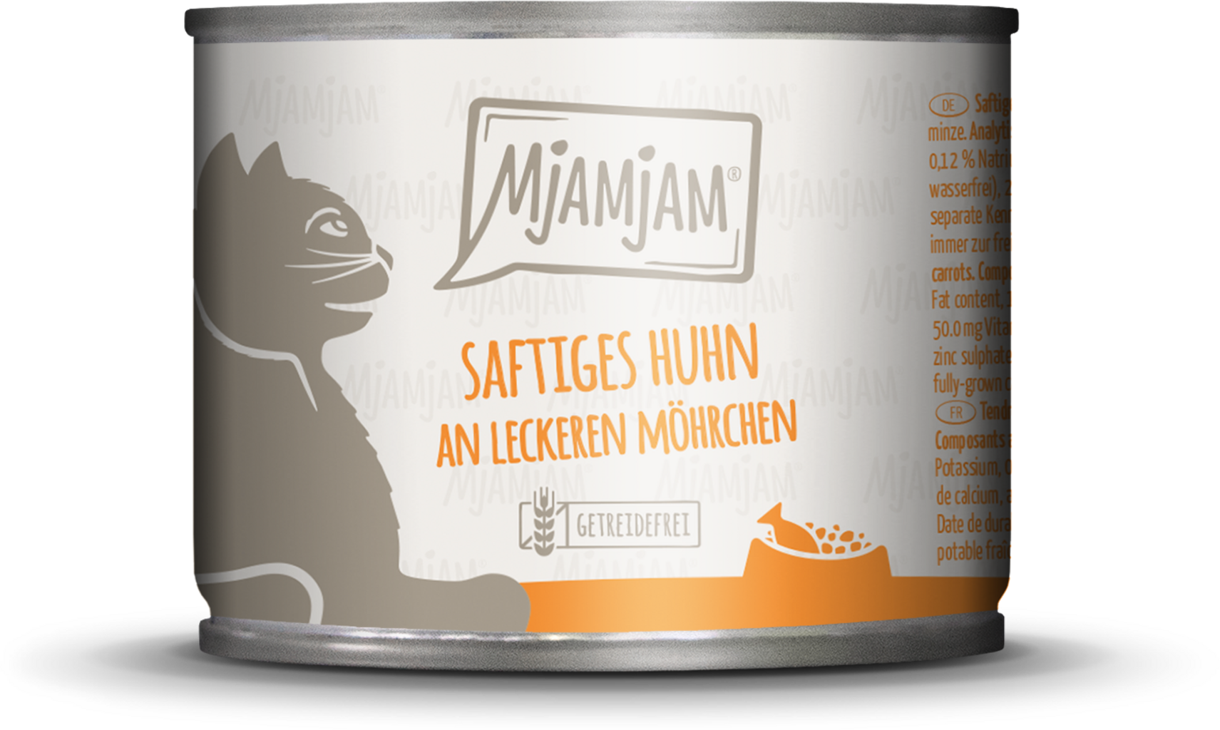 Mjamjam wet food pampers your cat with rich flavours, exceptional quality, and a touch of love. Your feline friend will enjoy a wholesome meal featuring tender chicken, crunchy carrots, and a hint of catnip—perfectly crafted to meet all their needs.