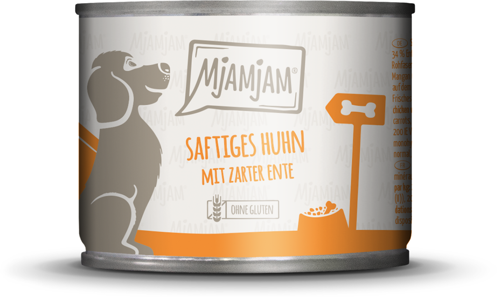 Mjamjam's wet food is a true indulgence for your dog, combining rich flavour, exceptional quality, and a touch of love. Your four-legged friend will enjoy a wholesome meal of fresh chicken, tender duck, nourishing carrots, and millet, providing a well-rounded and satisfying dish that ensures they receive everything they need.