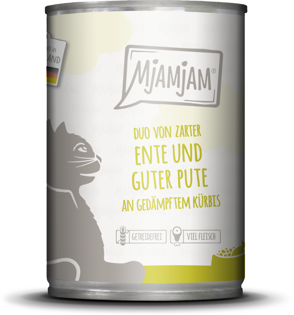 Yum, simply delicious! This exquisite composition of duck and turkey with steamed pumpkin tastes irresistibly delicious and will spoil your cat with a true explosion of flavour.