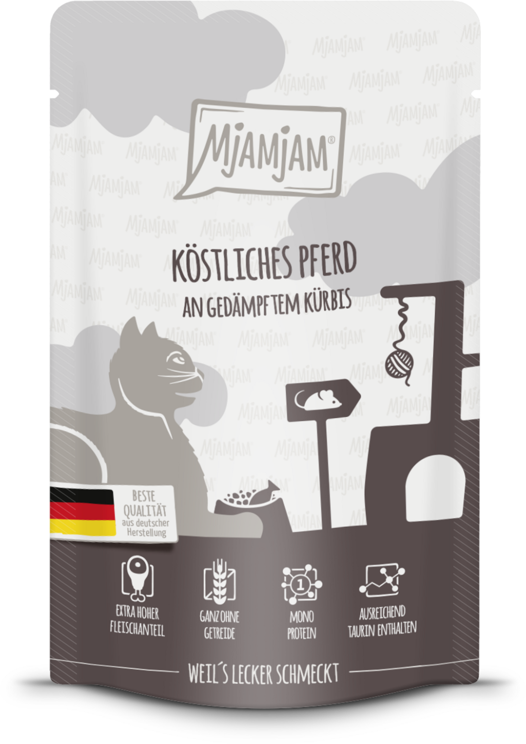 Mjamjam Portion Bags indulge your cat with rich flavours, exceptional quality, and a touch of love. Your feline friend will enjoy a wholesome meal crafted with fresh horse meat and delicious pumpkin, enriched with taurine to support their health and well-being—ensuring your beloved companion lacks nothing.