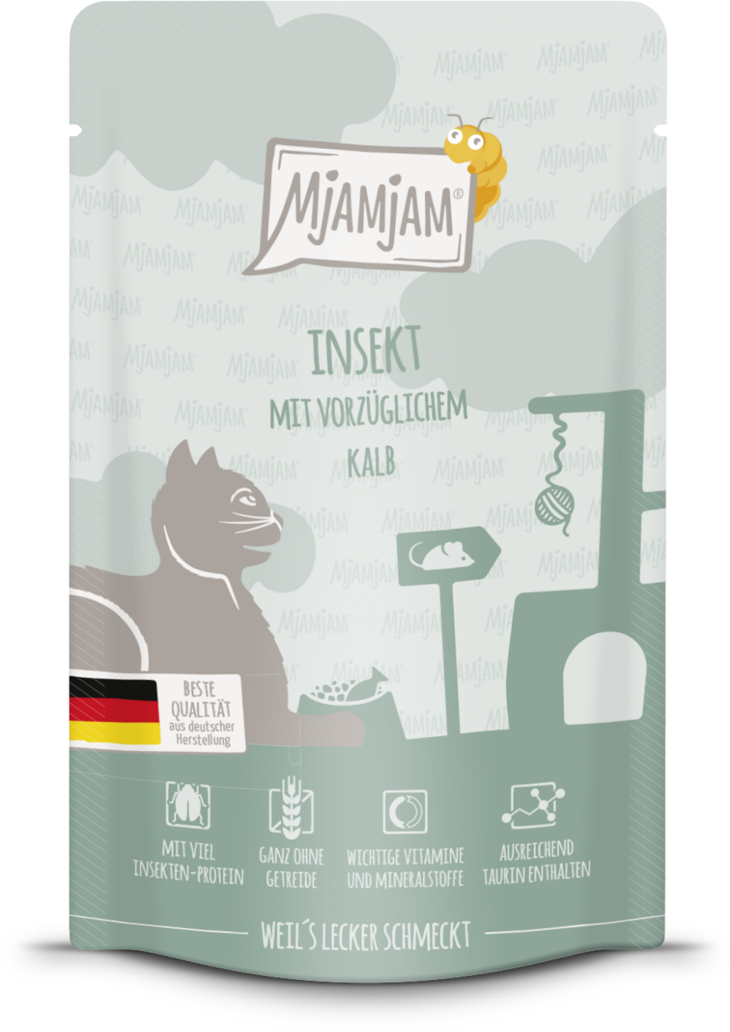 Mjamjam Portion Bags treat your cat to rich flavour, exceptional quality, and a touch of love. Your tiger can look forward to a wholesome meal made with anti-allergenic insects and tender veal, providing a unique, species-appropriate meal. Enriched with taurine, an essential nutrient for cats, it ensures your cherished companion has everything they need to thrive.