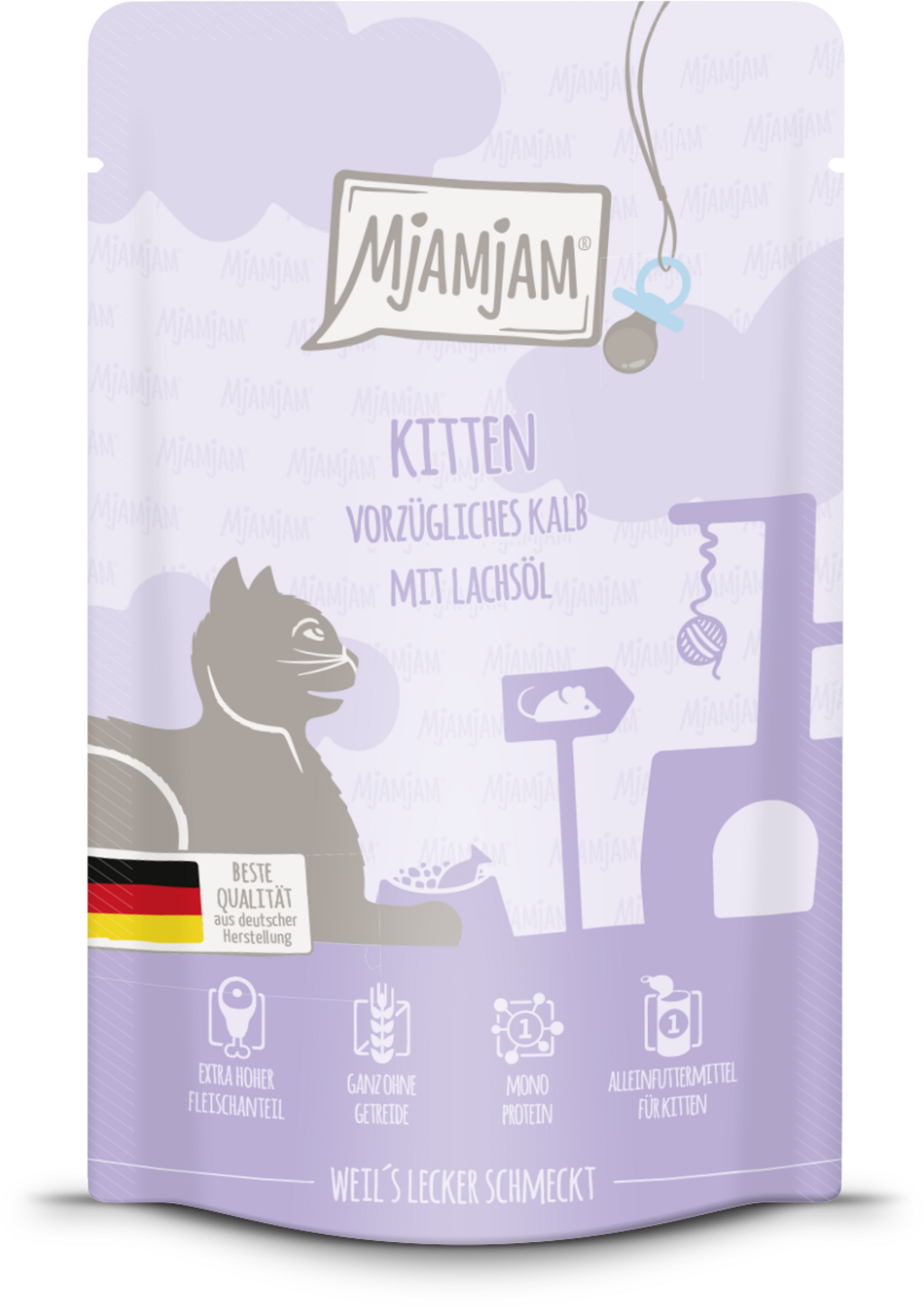 Mjamjam Portion Bags pamper your kitten with rich flavour, unmatched quality, and a touch of love. Your kitten will enjoy a wholesome meal made with tender veal and high-quality salmon oil, offering a delicious and nutritious experience. Enriched with taurine, an essential nutrient for kittens, it ensures your little one has everything they need to grow and thrive.