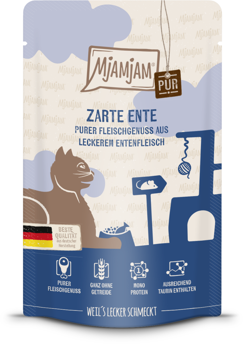 Mjamjam Portion Bags pamper your cat with rich flavour, exceptional quality, and a touch of love. With duck meat as the sole source of protein, this meal will have your velvet paw’s taste buds dancing while providing a wholesome, species-appropriate meal. Enriched with taurine, an essential nutrient for cats, it ensures your beloved pet has everything they need to thrive.