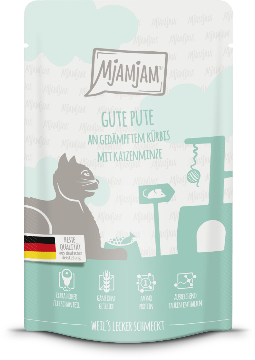 Mjamjam Portion Bags delight your cat with rich flavours, exceptional quality, and a touch of love. Your little tiger will enjoy a wholesome meal made with fresh turkey, steamed pumpkin, and a hint of catnip for extra indulgence. Enriched with taurine, essential for feline health, this meal ensures your beloved companion gets everything they need to thrive.