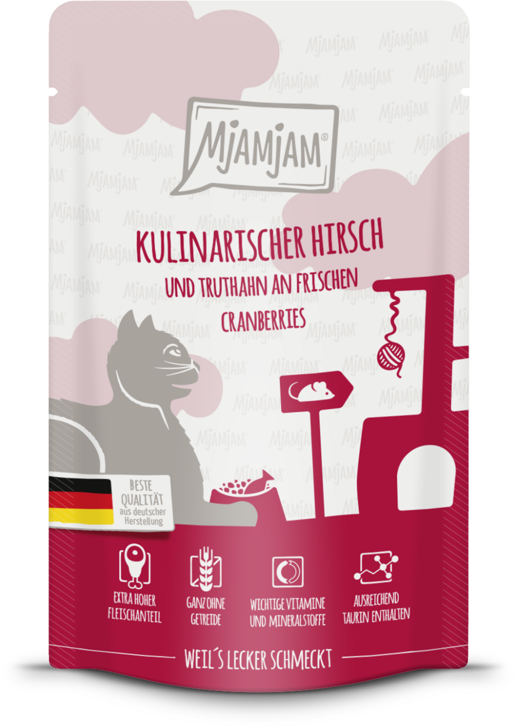 Mjamjam Portion Bags delight your cat with rich flavour, exceptional quality, and a touch of love. Your little tiger will enjoy a wholesome meal made with fresh venison, tender turkey, and delicious cranberries, creating a flavorful and nutritious experience. Enriched with taurine, an essential nutrient for cats, it ensures your feline companion has everything they need to thrive.