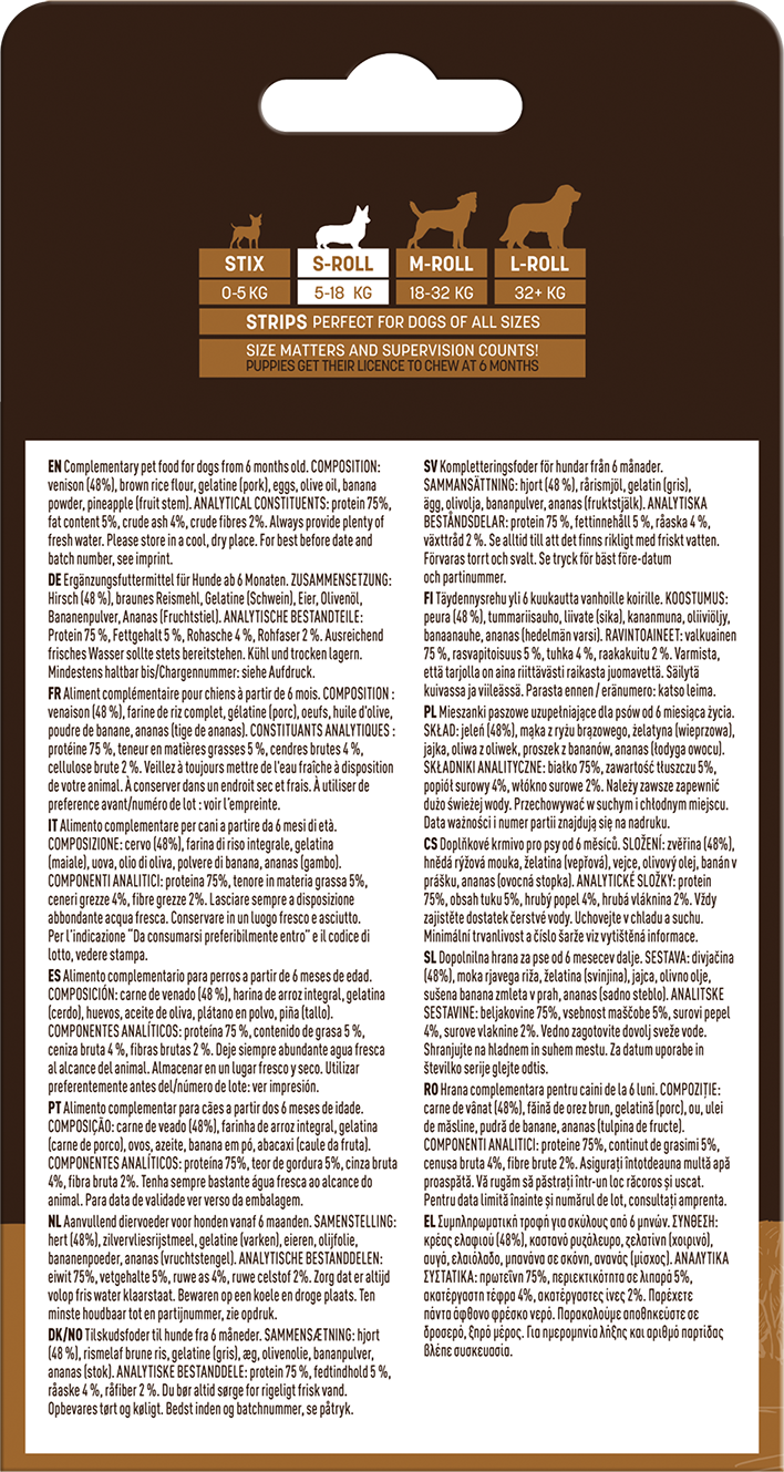 48 % Deer, Brown rice flour, Gelatine (Pork), Eggs, Olive oil, Banana powder, Pineapple (Fruit stalk)