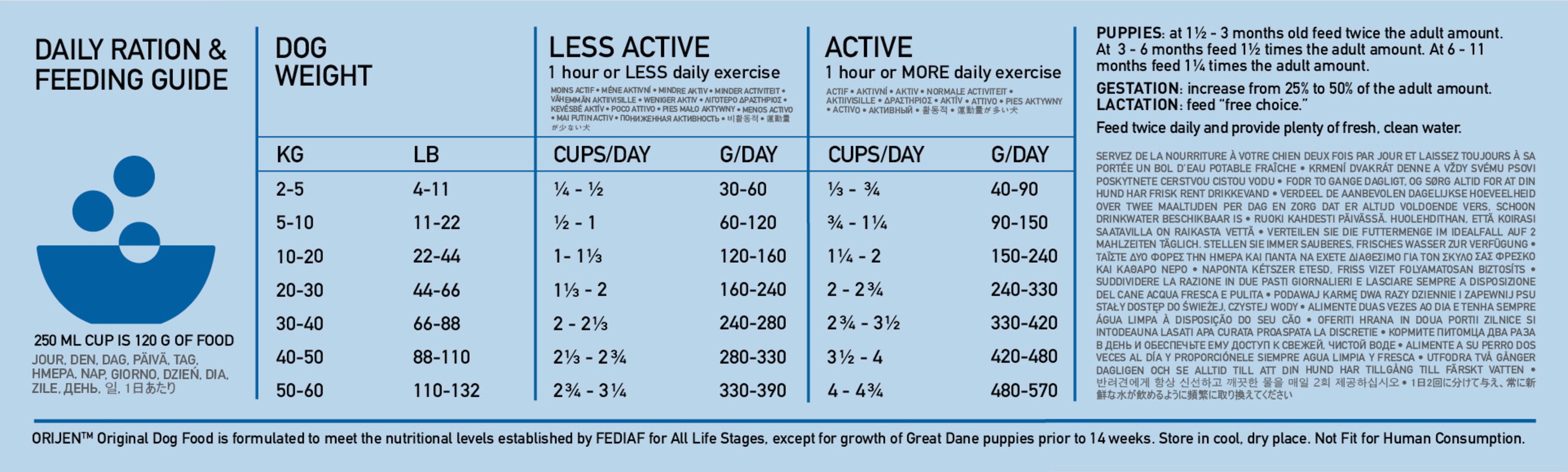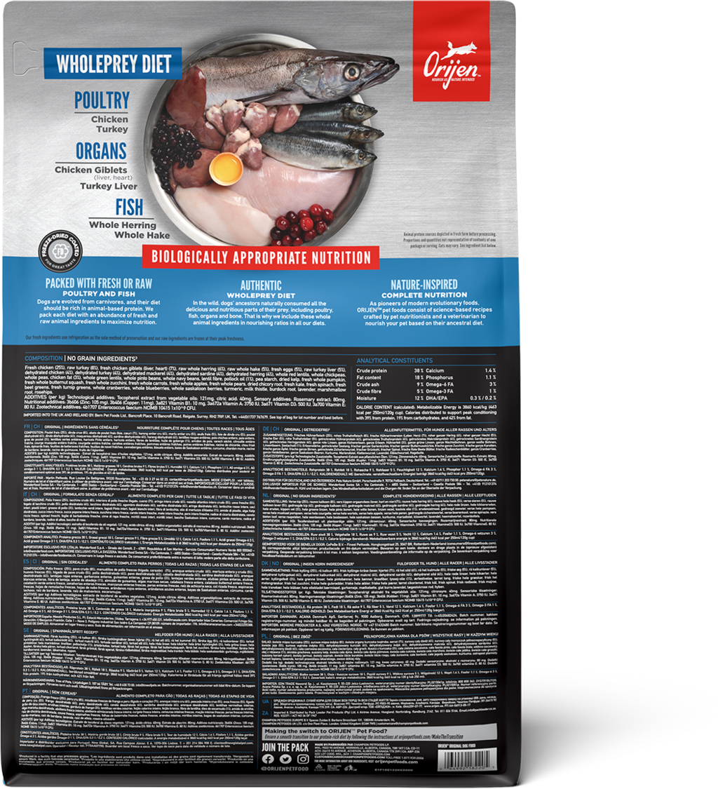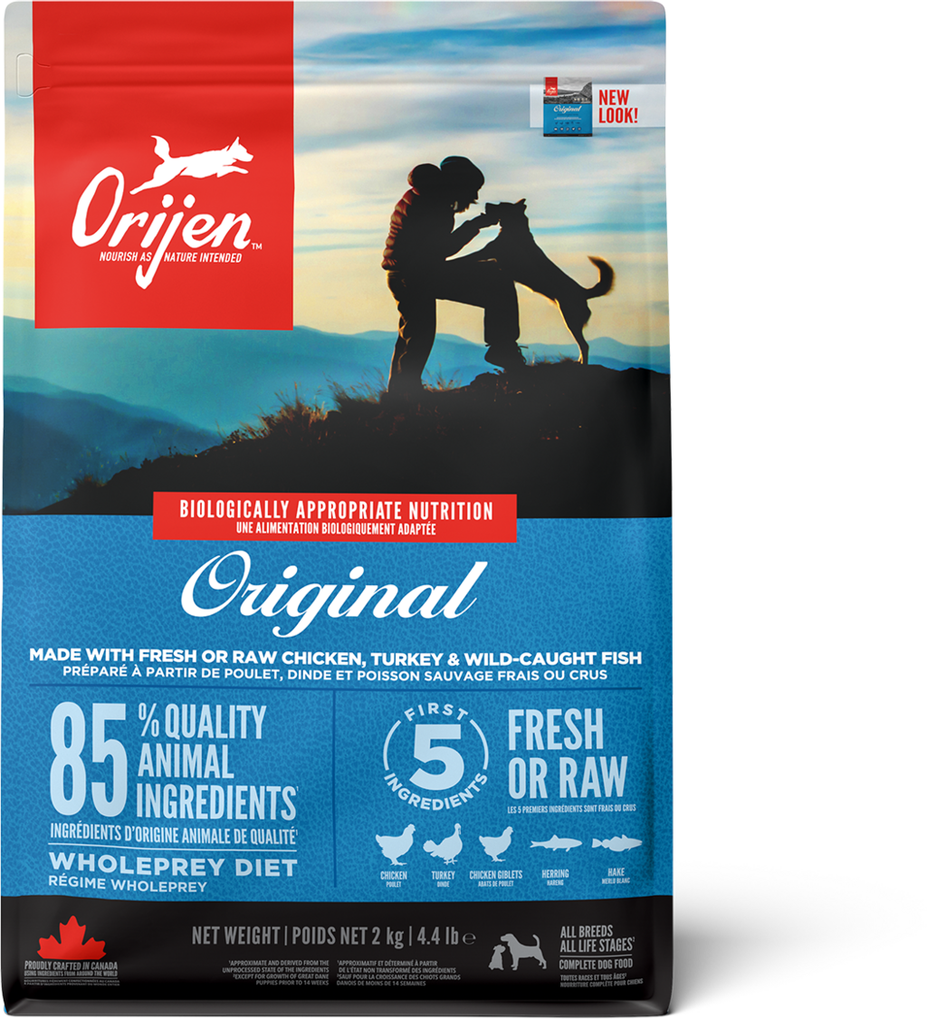 The Original dog food by Orijen is suitable for all breeds and ages. It can be fed to puppies, adult dogs, and senior dogs alike. The food contains high-quality poultry and fish components.