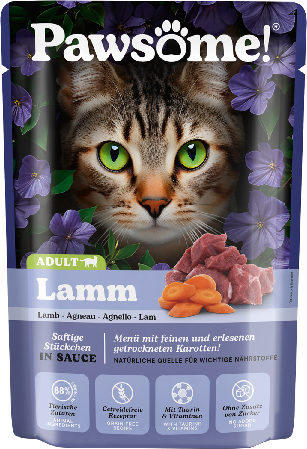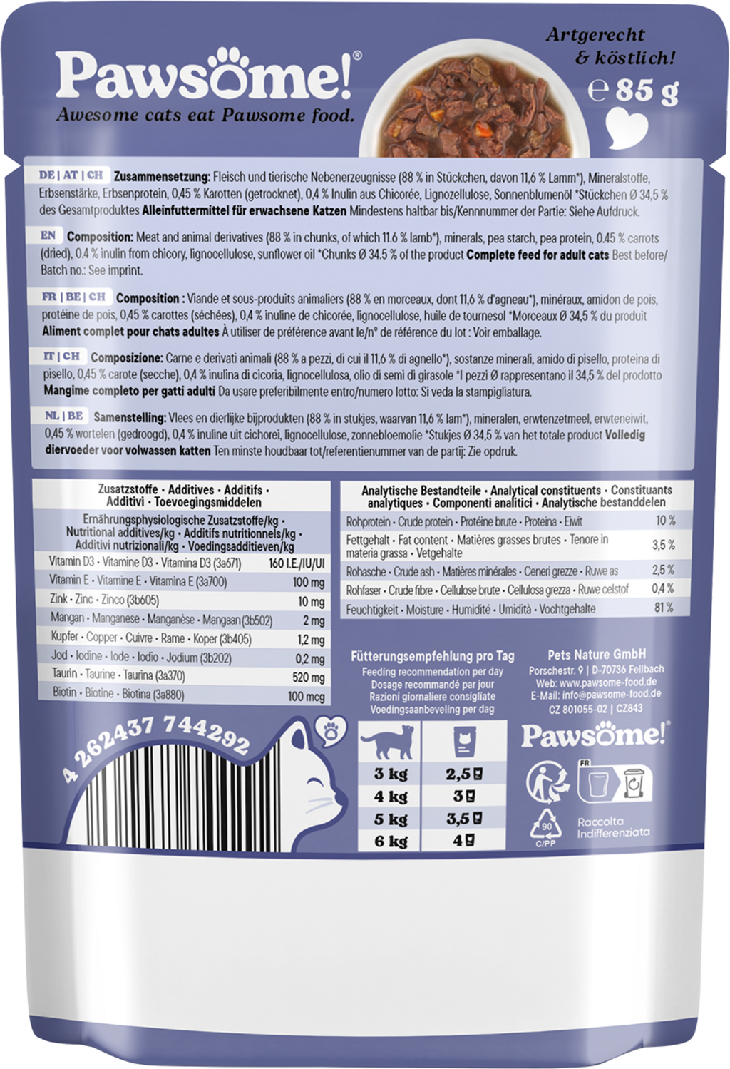 Pawesome! wet food with juicy meat pieces and delicious sauce will win over even the fussiest cats. This tasty complete food relies on natural ingredients specially suited to the respective life stage of your cat. Carefully selected superfoods deliver important vitamins and nutrients.