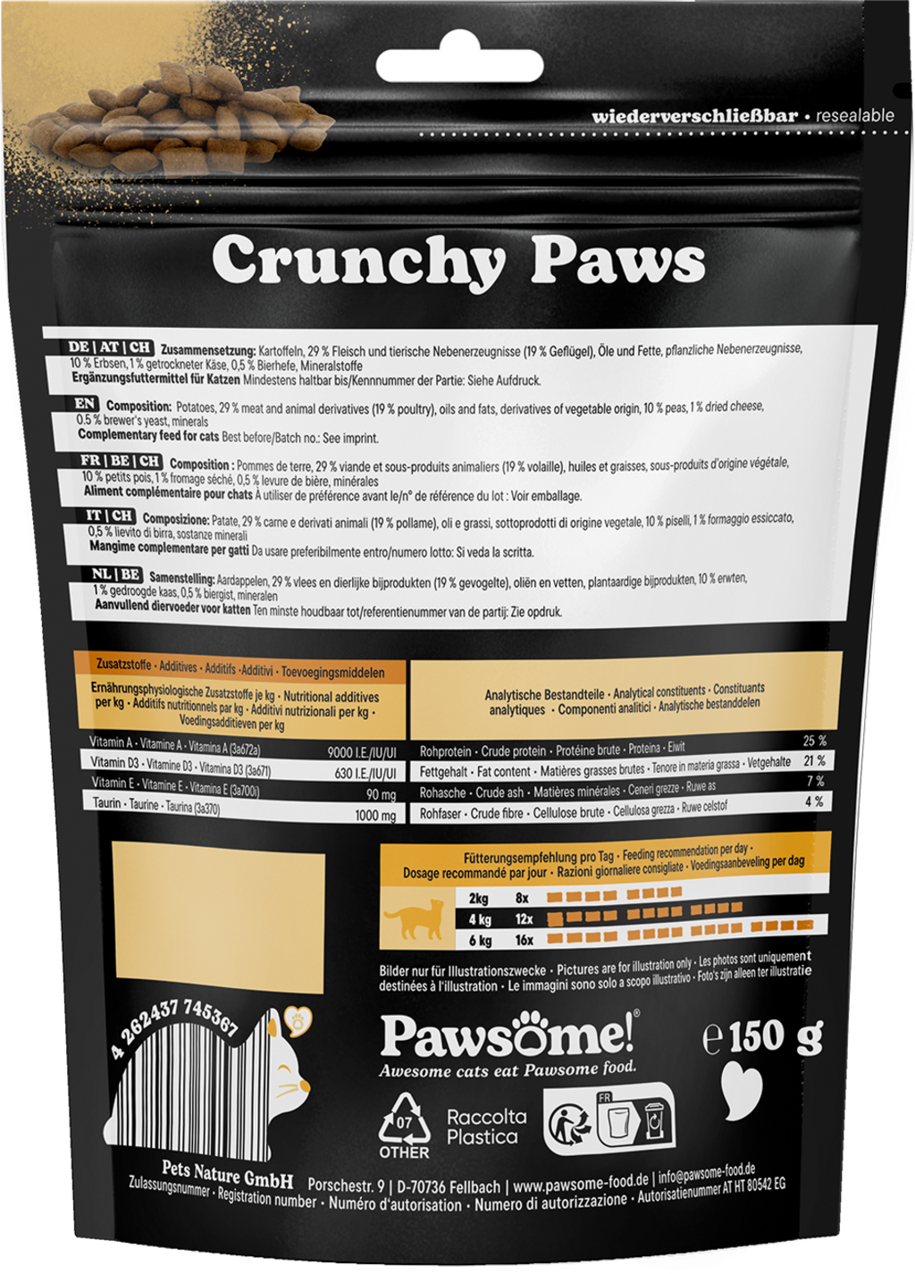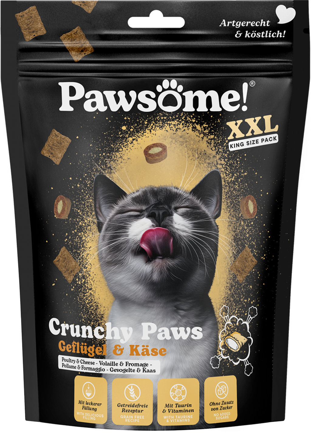 With Pawsome! Paws, every snack time becomes a delight. These crunchy treats with a delicious filling are sure to please and contain no grains or added sugar. Taurine, vitamins, brewer's yeast as a natural source of B vitamins, and catnip ensure a very special snack break.