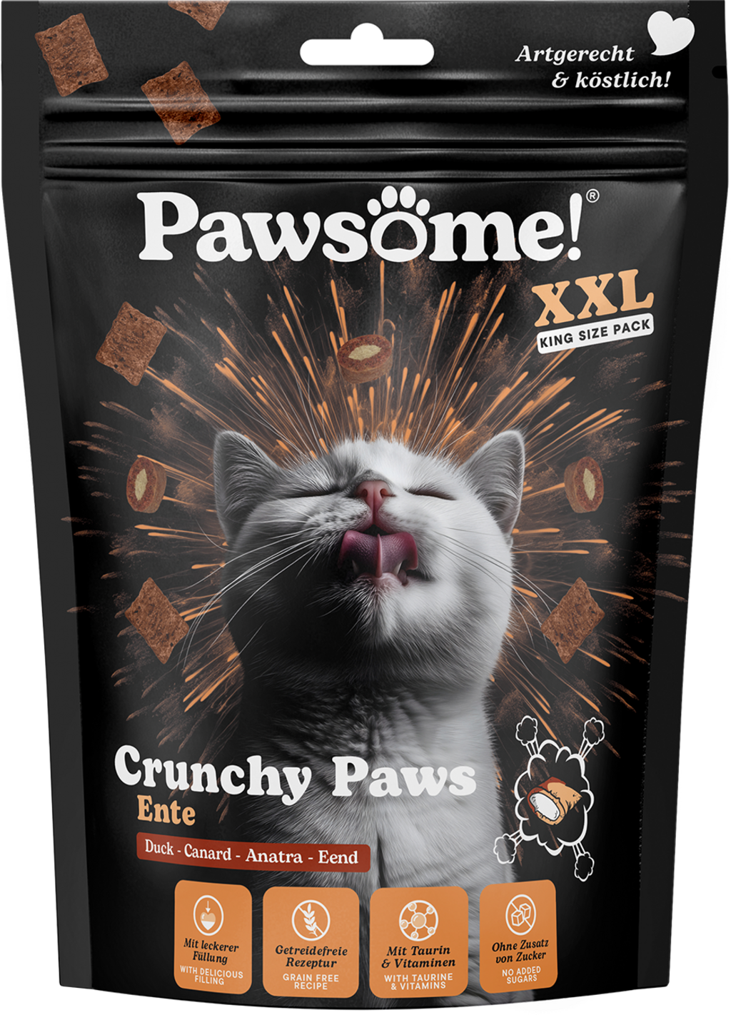 With Pawsome! Paws, every snack time becomes a delight. These crunchy treats with a delicious filling are sure to please and contain no grains or added sugar. Taurine, vitamins, brewer's yeast as a natural source of B vitamins, and catnip ensure a very special snack break.