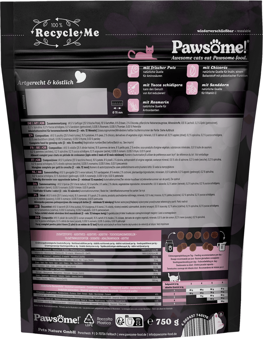69,5 % Poultry, 15 % Potatoes, 8 % Peas, 2 % Chicory, Vegetable by-products, Minerals, 0,5 % Salmon oil, 0,2 % Dried apples, 0,2 % Spirulina, 0,2 % Yucca schidigera, 0,1 % Dried sea buckthorn, 0,035 % Rosemary, 0,035 % Thyme, 0,03 % Parsley
