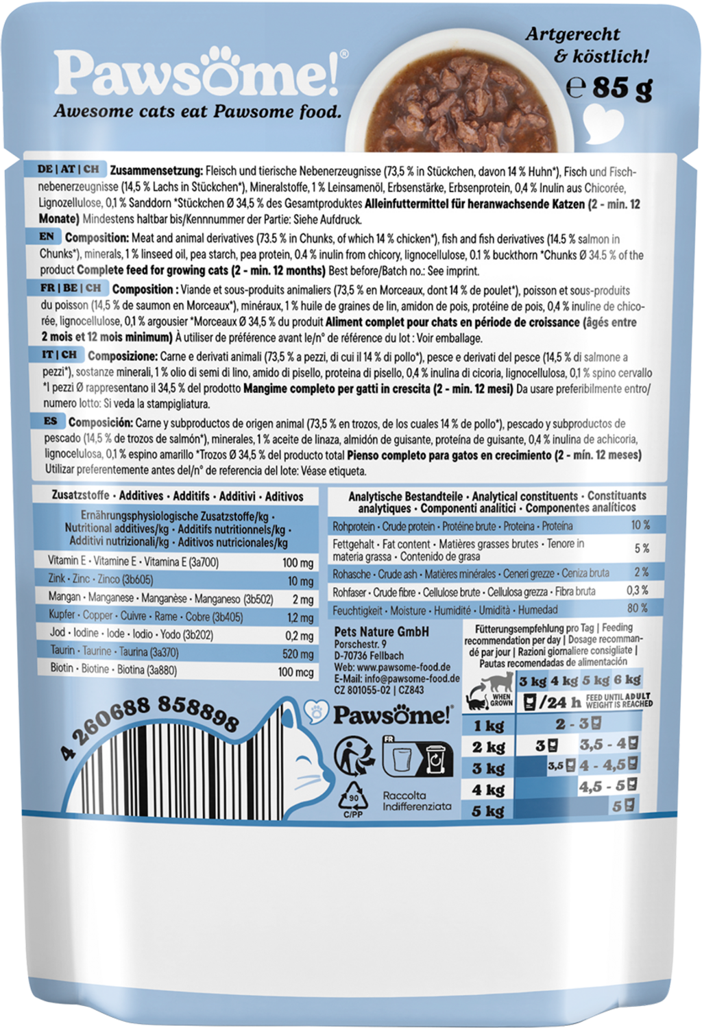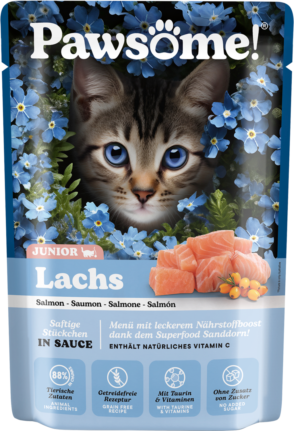 Pawesome! wet food with juicy meat pieces and delicious sauce will win over even the fussiest cats. This tasty complete food relies on natural ingredients specially suited to the respective life stage of your cat. Carefully selected superfoods deliver important vitamins and nutrients.