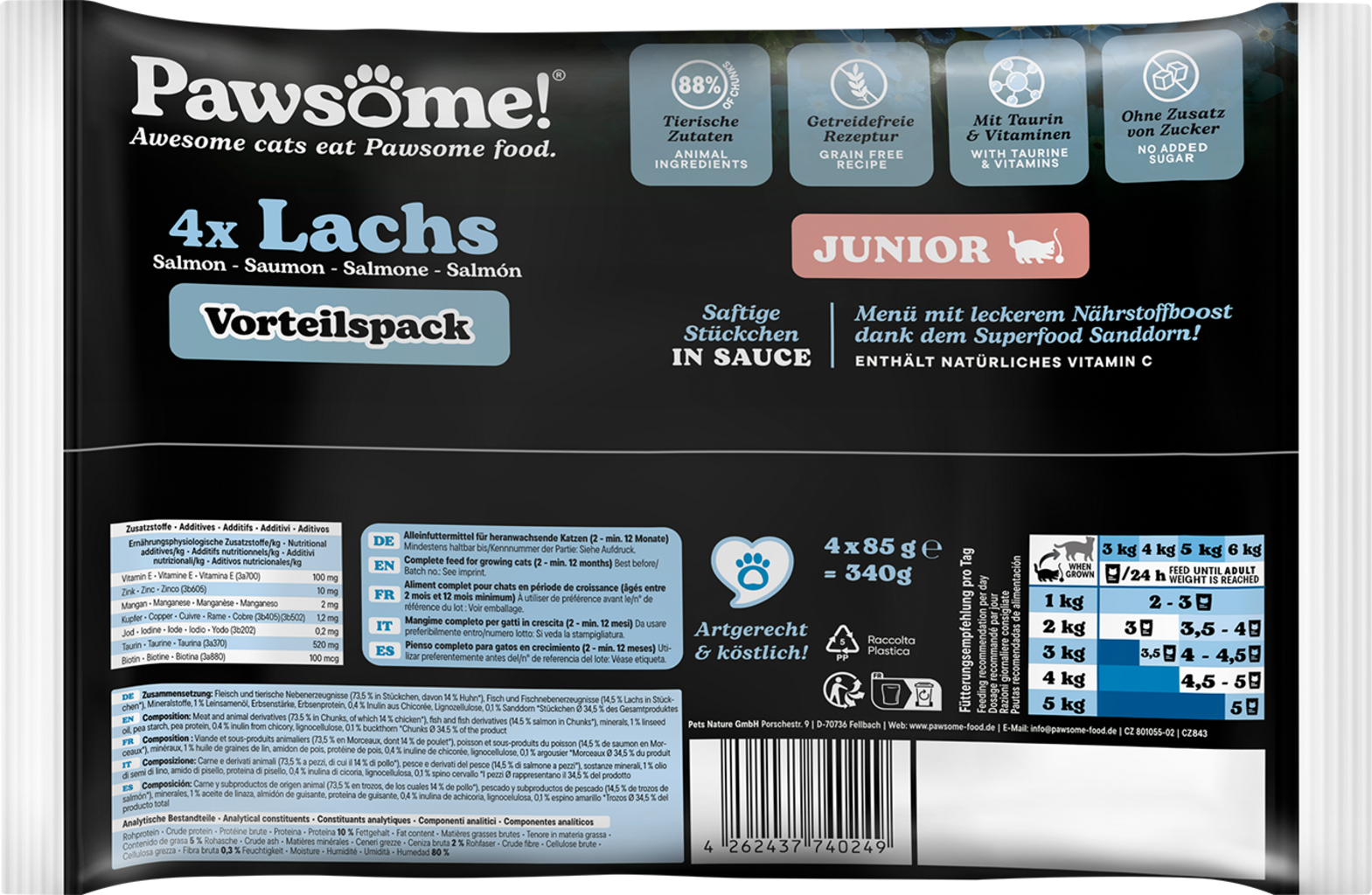 Pawesome! wet food with juicy meat pieces and delicious sauce will win over even the fussiest cats. This tasty complete food relies on natural ingredients specially suited to the respective life stage of your cat. Carefully selected superfoods deliver important vitamins and nutrients.