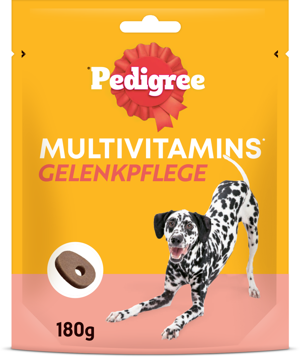 Multivitamins Joint Care from Pedigree is a supplementary food for adult dogs. The low-fat mixture (less than 5% fat) of vitamins and glucosamines can be offered to your pet every day with their main food. The irresistible chicken flavour is readily accepted.