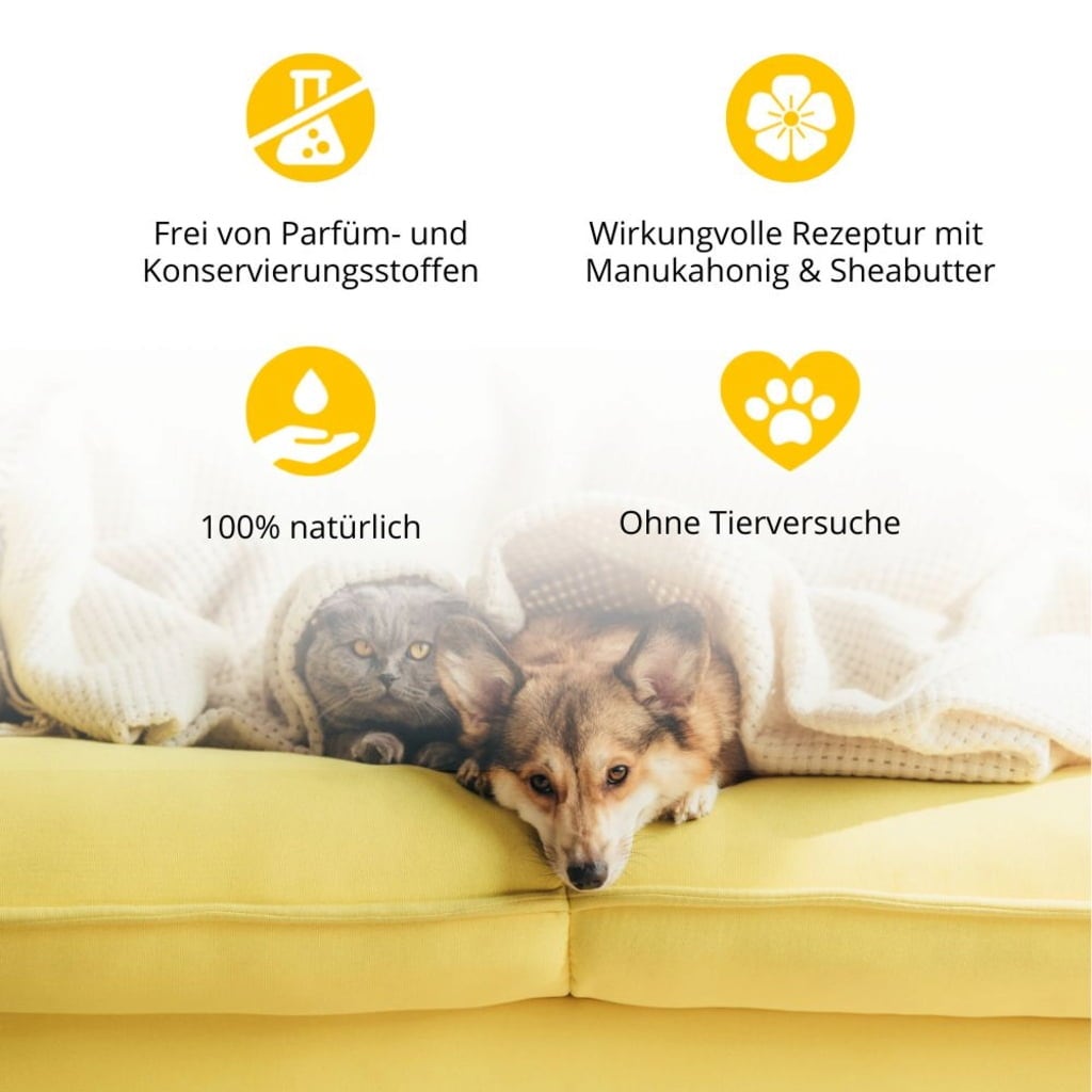 The balm is made with 100% natural ingredients and contains a unique combination of manuka honey and shea butter. Free from parabens, colourants, mineral oils or silicones. Also suitable for extra sensitive paws and skin.