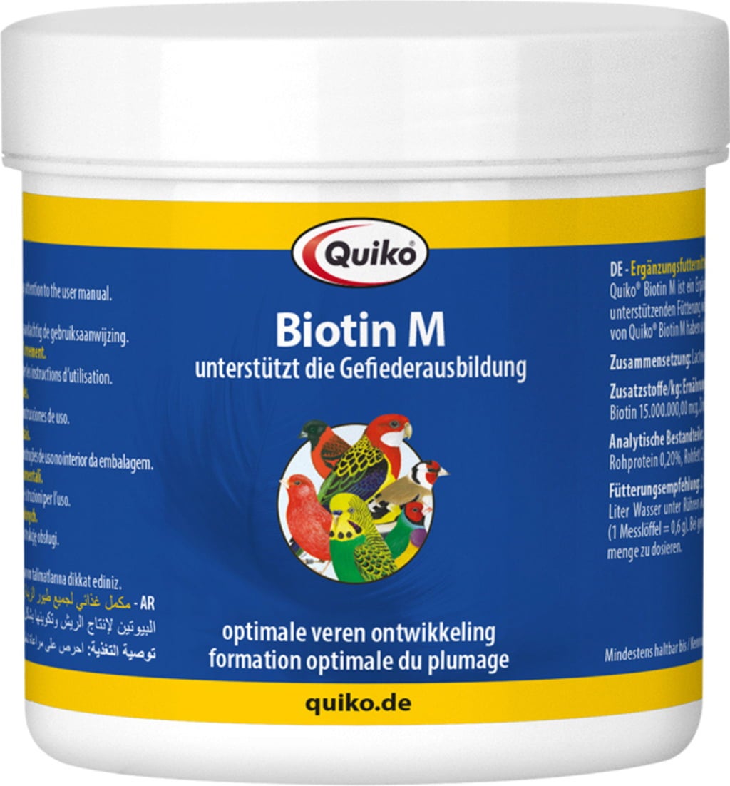 - Mix 6 g Quiko Biotin M into 500 g Quiko Egg Food twice a week or dissolve it in 500 ml of water. Increase the dosage if necessary.