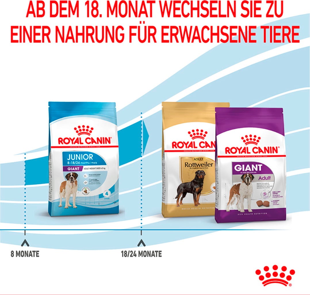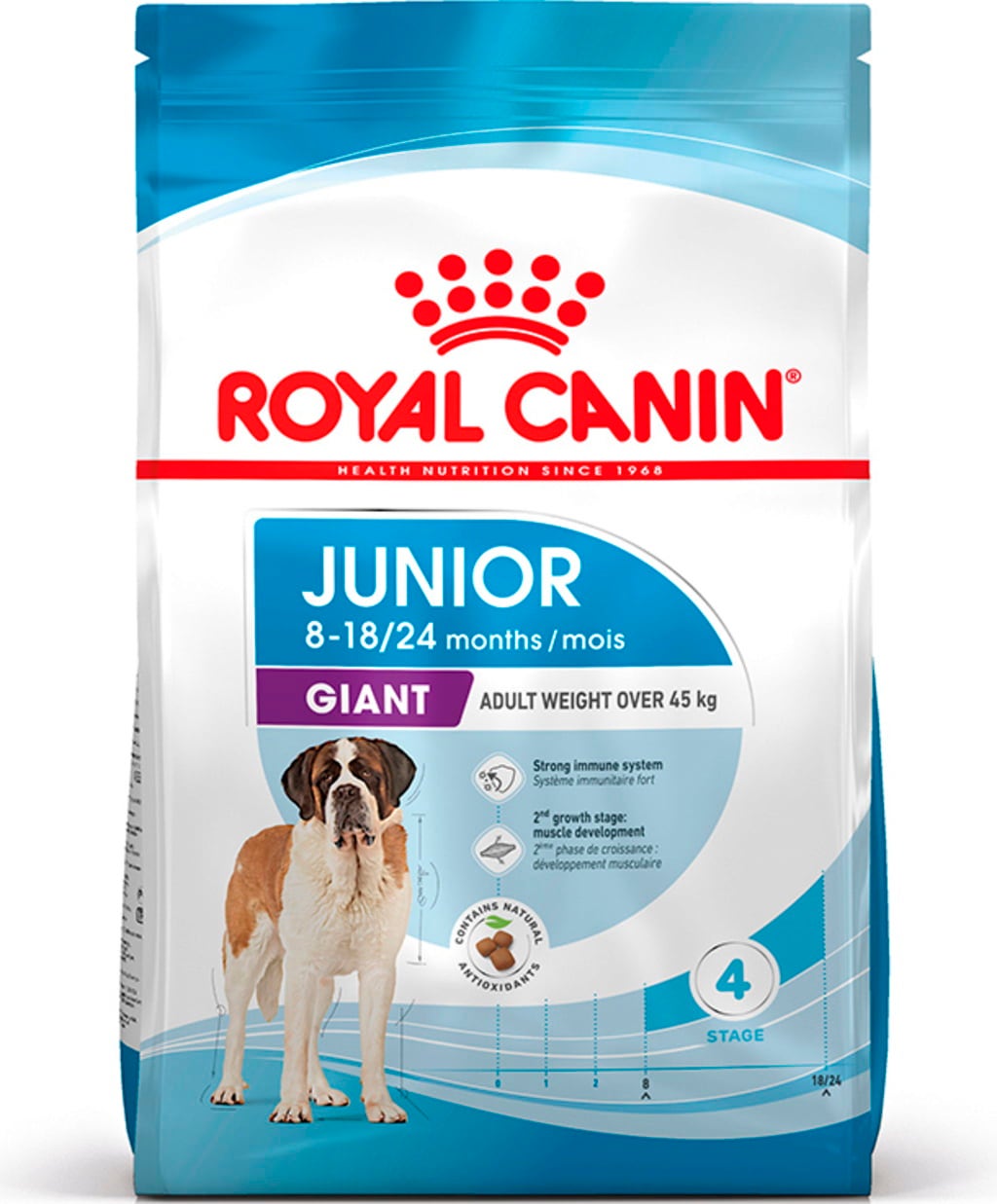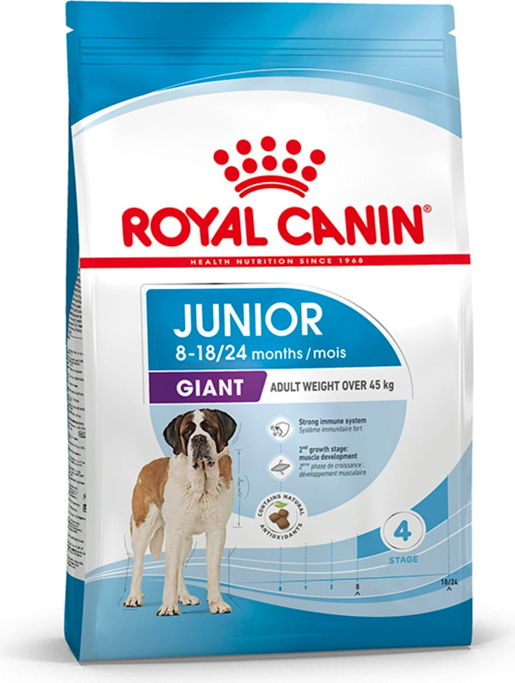 Giant dogs take around 18-24 months to reach their adult weight of 45+ kg. During this time, their nutritional needs evolve, so two diets have been developed: ROYAL CANIN® Giant Puppy, to be given between 2 and 8 months, and this formula - ROYAL CANIN® Giant Junior - for the period of 8 to 18/24 months.