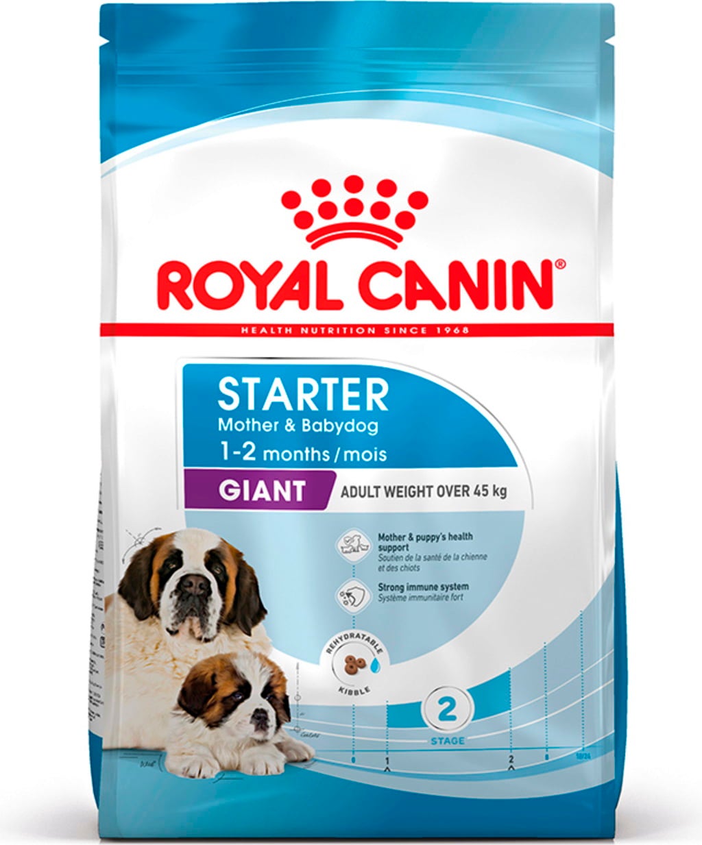 ROYAL CANIN® Giant Starter Mother & Babydog is specially formulated to support the nutritional needs of new mothers and their puppies. This formula is suitable for giant-sized adult dogs that weigh over 45kg, and for weaning puppies up to 2 months old. Giant dogs often have big litters - sometimes of more than 10 puppies - and this is very demanding on their metabolism. This tailored diet is specially adapted to meet your giant dog's high energy needs at the end of gestation and during lactation. It's also formulated to support the healthy development of nursing puppies.