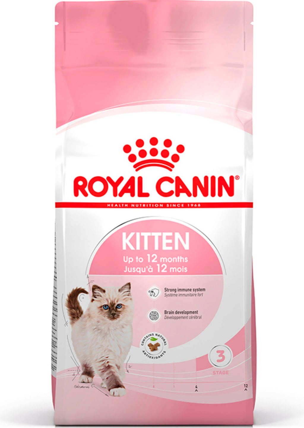 ROYAL CANIN® Kitten is also enriched with omega-3 fatty acids (DHA) to support brain development and healthy vision. Thanks to a combination of beneficial prebiotics (MOS) and highly digestible proteins, ROYAL CANIN® Kitten also helps to support a healthy balance of intestinal microbiota (gut flora) for good digestion. The kibble in ROYAL CANIN® Kitten has also been specially designed for your kitten's tiny mouth. A mechanical brushing effect as your kitten chews helps to support dental health.