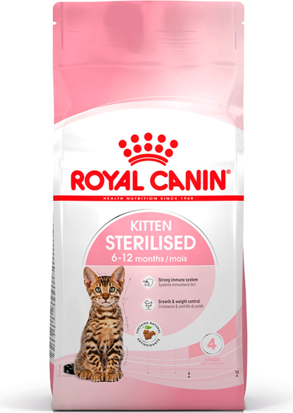 ROYAL CANIN® Sterilised Kitten is specially formulated to support the nutritional needs of sterilised kittens in the 'consolidation phase' of their growth. This formula is suitable for 6 to 12-month-old sterilised kittens as they undergo a period of significant physical and behavioural changes. This tailored diet contains a moderate fat content to help reduce the risk of weight gain, while still containing optimal levels of protein, calcium and phosphorus for healthy development. It also contains nutrients such as vitamins C and E to support the development of the kitten's healthy immune system.