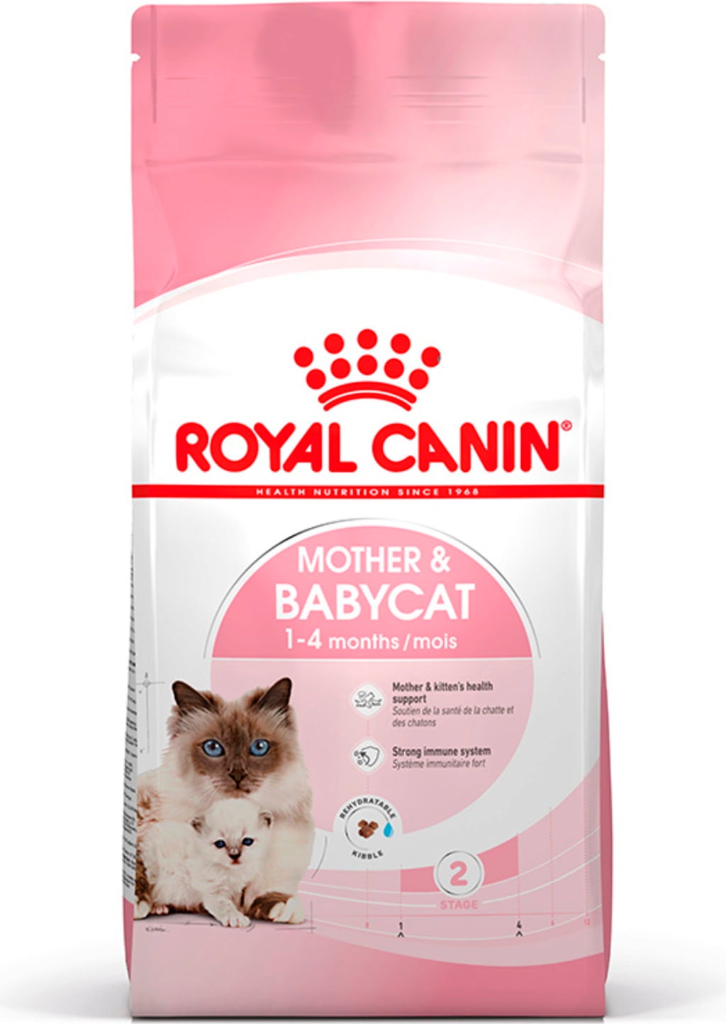ROYAL CANIN® Mother & Babycat is specially adapted to meet your cat's high energy needs at the end of gestation and during lactation. It's also formulated to support the healthy development of nursing kittens up to 4 months old. ROYAL CANIN® Mother & Babycat contains nutrients, including vitamins C and E, to support a healthy immune system.