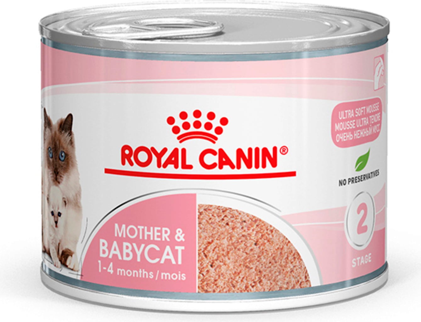ROYAL CANIN® Mother & Babycat Ultra Soft Mousse is specially adapted to meet your cat's high energy needs at the end of gestation and during lactation. It's also formulated to have a palatable, soft texture that is ideal for nursing kittens up to 4 months old. ROYAL CANIN® Mother & Babycat Ultra Soft Mousse contains nutrients, including vitamins C and E, to support a healthy immune system. This formula is enriched with Omega-3 fatty acids (DHA) to support brain development and healthy vision in young kittens. Thanks to a combination of beneficial prebiotics (MOS) and highly digestible proteins, ROYAL CANIN® Mother & Babycat Ultra Soft Mousse also helps to support a healthy balance of intestinal microbiota (gut flora) for good digestion.