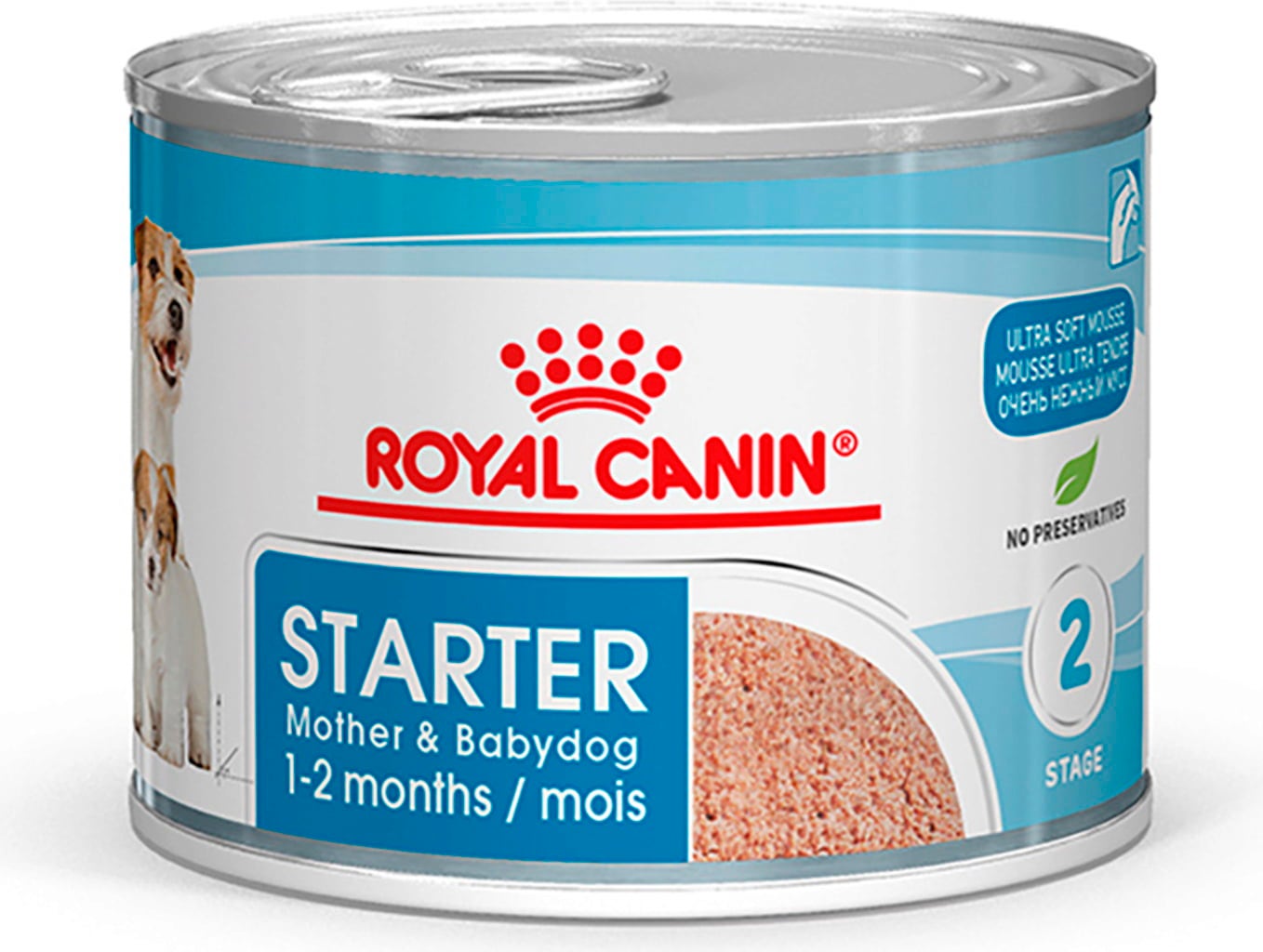 ROYAL CANIN® Starter Mousse Mother & Babydog is specially formulated to support the nutritional needs of pregnant or lactating mothers and weaning puppies up to the age of 2 months. This tailored diet has an ultra-soft mousse texture, which is adapted to the development of puppies' digestive systems and helps the transition to solid food. It is also highly nutritious for puppies and mothers alike.