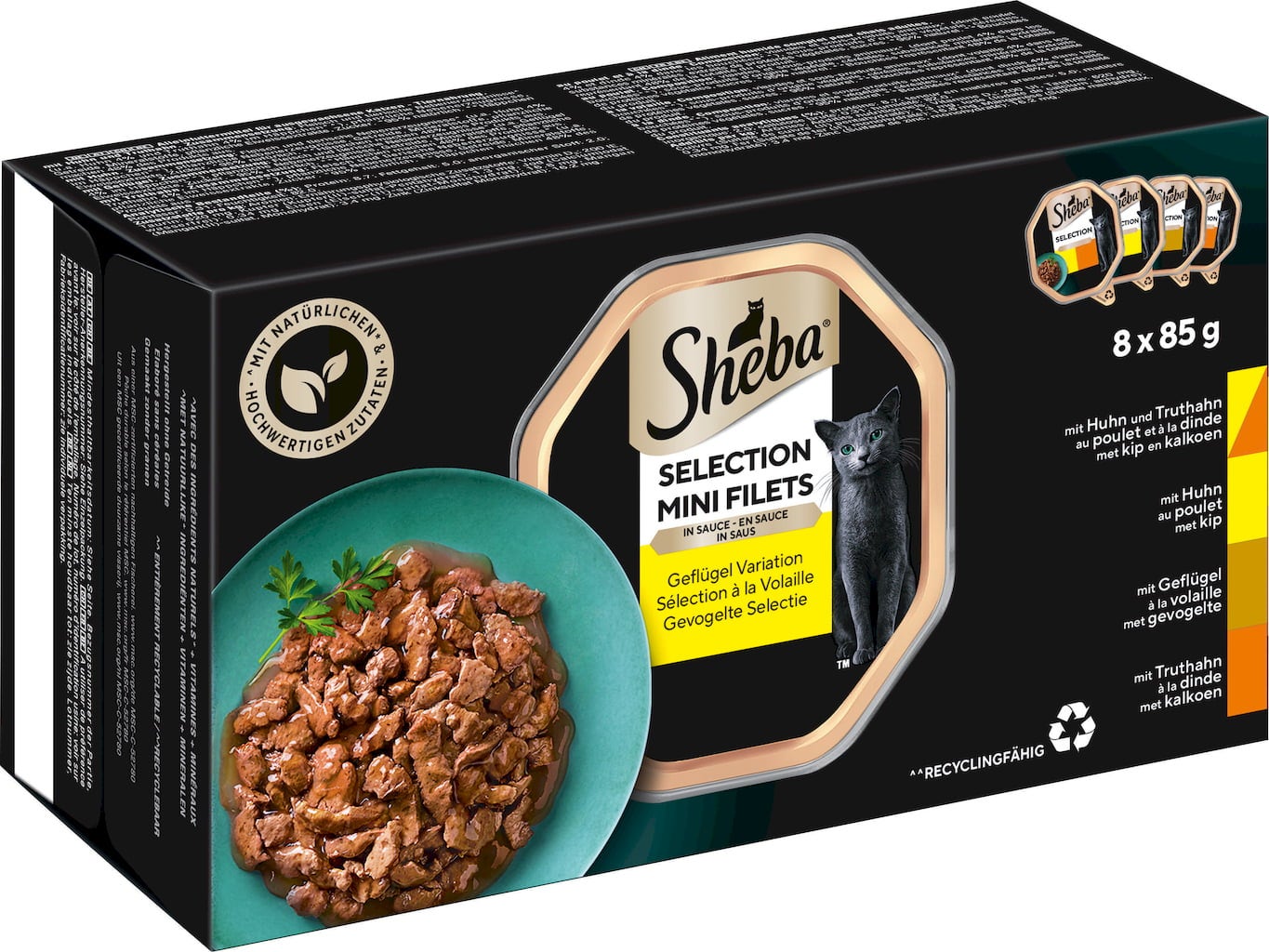 Fine chunks of meat in a flavourful sauce - Sheba Selection in Sauce lures cats to the food bowl no matter how well hidden and comfortable they are! High-quality recipes with carefully prepared ingredients, succulent meat pieces and zero artificial colours, flavours or preservatives.