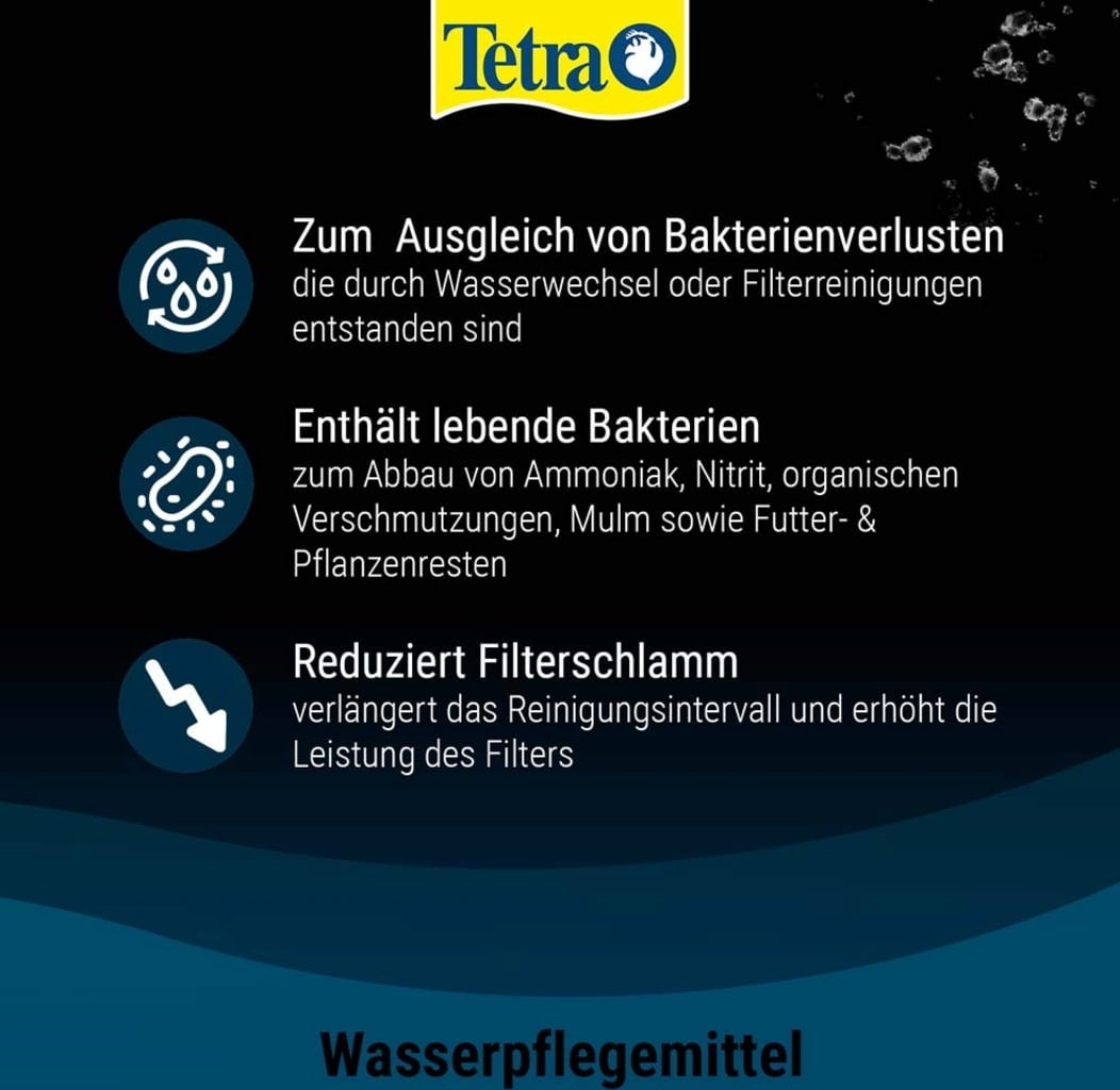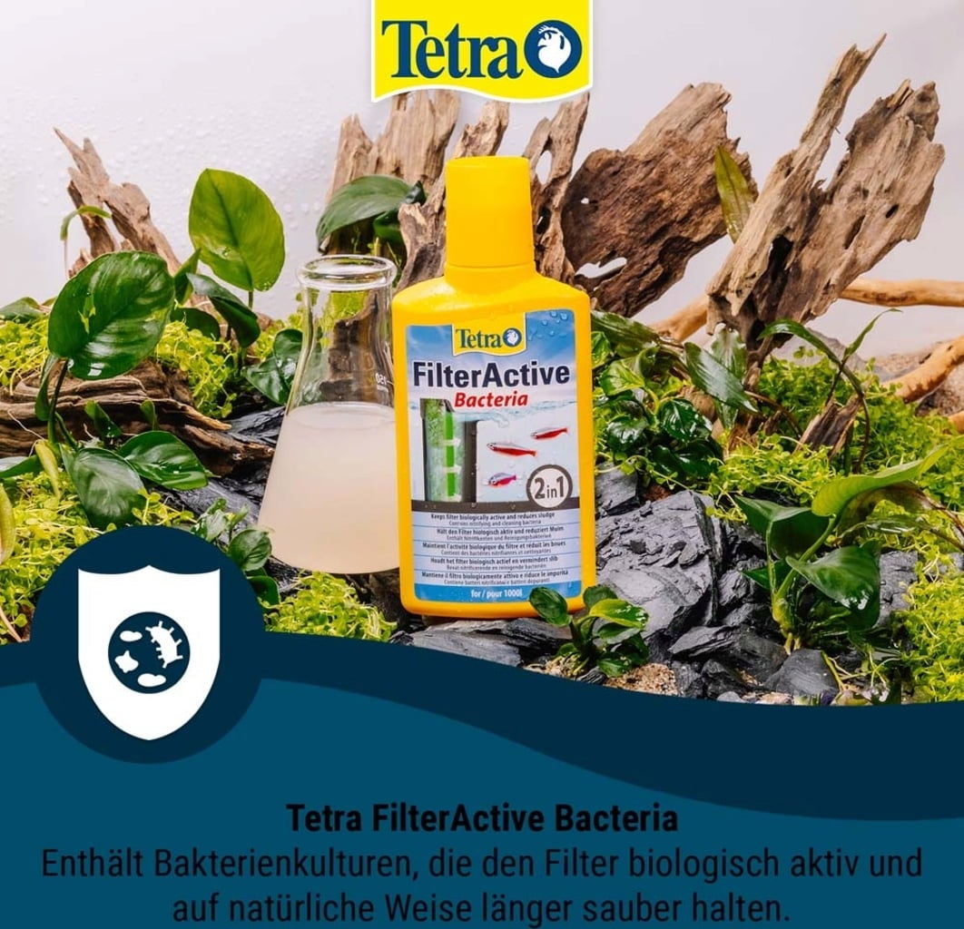 Tetra FilterActive adds active living bacteria and thus supports the permanent biological activity in the aquarium. The breakdown of pollutants such as ammonia and nitrite is accelerated. The cleaning performance of the filter for clear water is improved and the biological balance in the aquarium is maintained. Tetra FilterActive promotes good water values and the well-being of fish and increases filtering after filter maintenance or water changes.