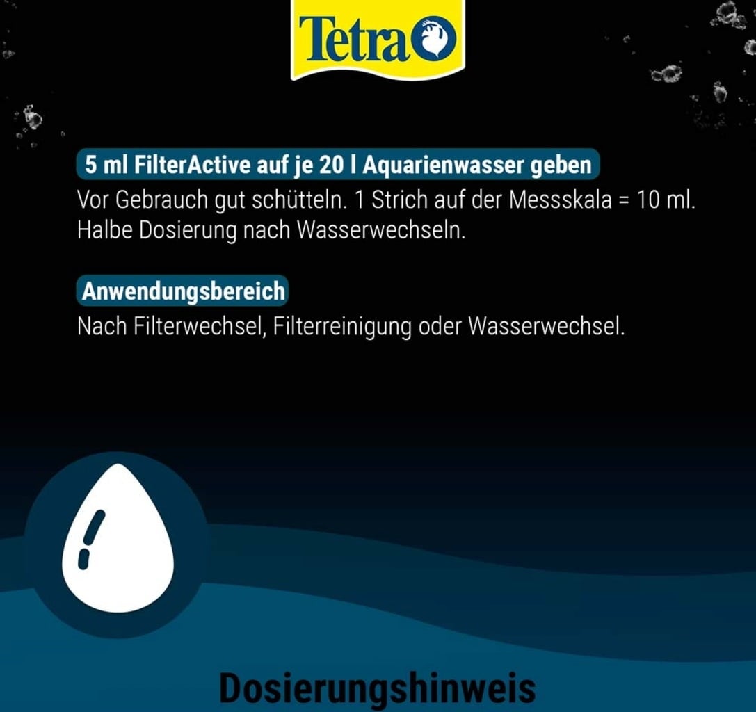 Tetra FilterActive replaces highly active, useful bacteria that are lost during filter cleaning or water changes, so that good water quality and the well-being of the fish are maintained!