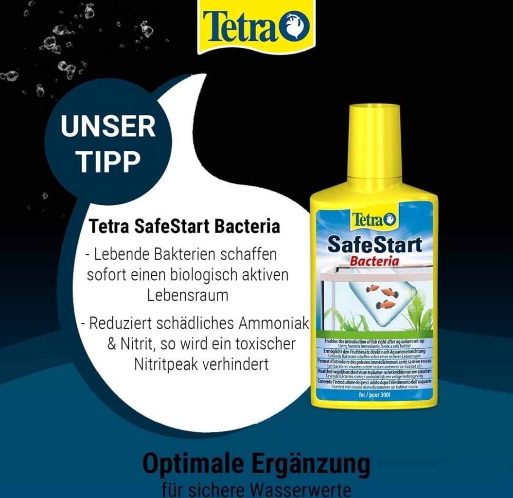 The water is not clarified mechanically by a filter system alone. Special bacteria are required for the conversion of ammonia to nitrate, which finds a large space in a sufficiently dimensioned filter system. With the use of Tetra SafeStart, the aquarist creates optimal conditions for good bioactivity in the aquarium. A widespread opinion that predominantly the bacteria of the Nitrobacter group are active as nitrifying bacteria in the aquarium has been scientifically refuted. In natural biofilms from aquariums, Tetra Research was able to identify the bacteria of the Nitrospira strain as the predominant representative of the nitrite-reducing bacteria. The ammonia, which is also very harmful to the fish, is broken down by bacteria of the genera Nitrospira and Nitrosomonas. The latest discoveries in microbiology ultimately led to SafeStart's product development. Optimal conditions for the settlement of these important bacteria are achieved with Tetra Bactozyme. It covers all surfaces with a bacteria-promoting biofilm on which nitrifying bacteria can develop. Tetra Biocoryn complements these products.