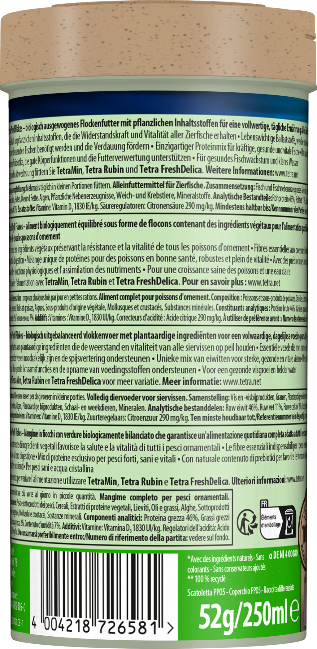 Tetra Phyll is a biologically balanced staple food ensures a complete diet for herbivorous ornamental fish. The high content of vegetable ingredients supports normal health as well as the immunity and vitality.