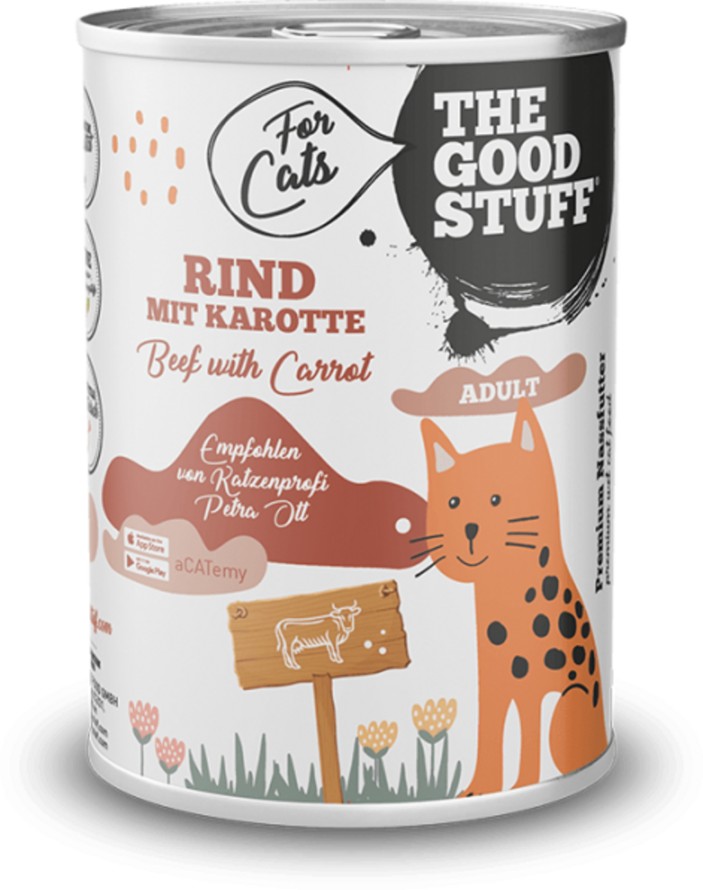 Cats are known for their gourmet palate, which is why The Goodstuff focuses on the essentials in its food recipes. 70% meat from muscle meat and offal is combined in this composition with selected nutrients from carrots. In order to maintain the absolute naturalness and an excellent taste, the pieces of meat and carrots are preserved in their own juice and there are no other preservatives, colours or flavourings at all. Completely grain-free.