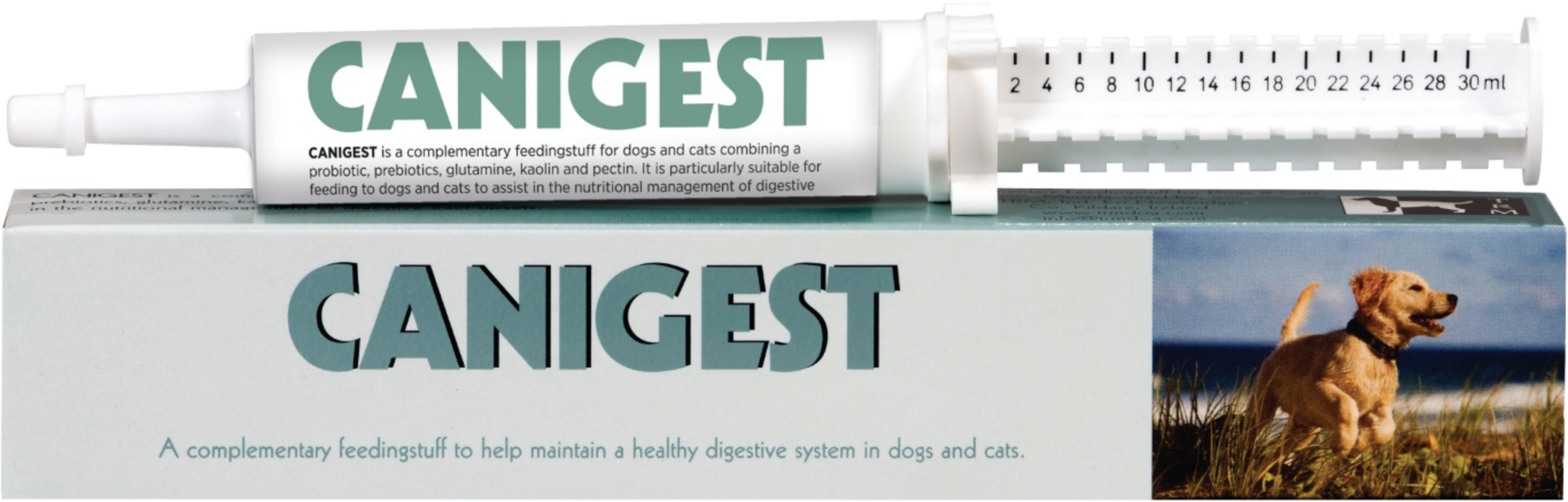 Canigest by TRM is a feed supplement with probiotics, prebiotics, glutamine, kaolin and pectin. It can be given to both cats and dogs.